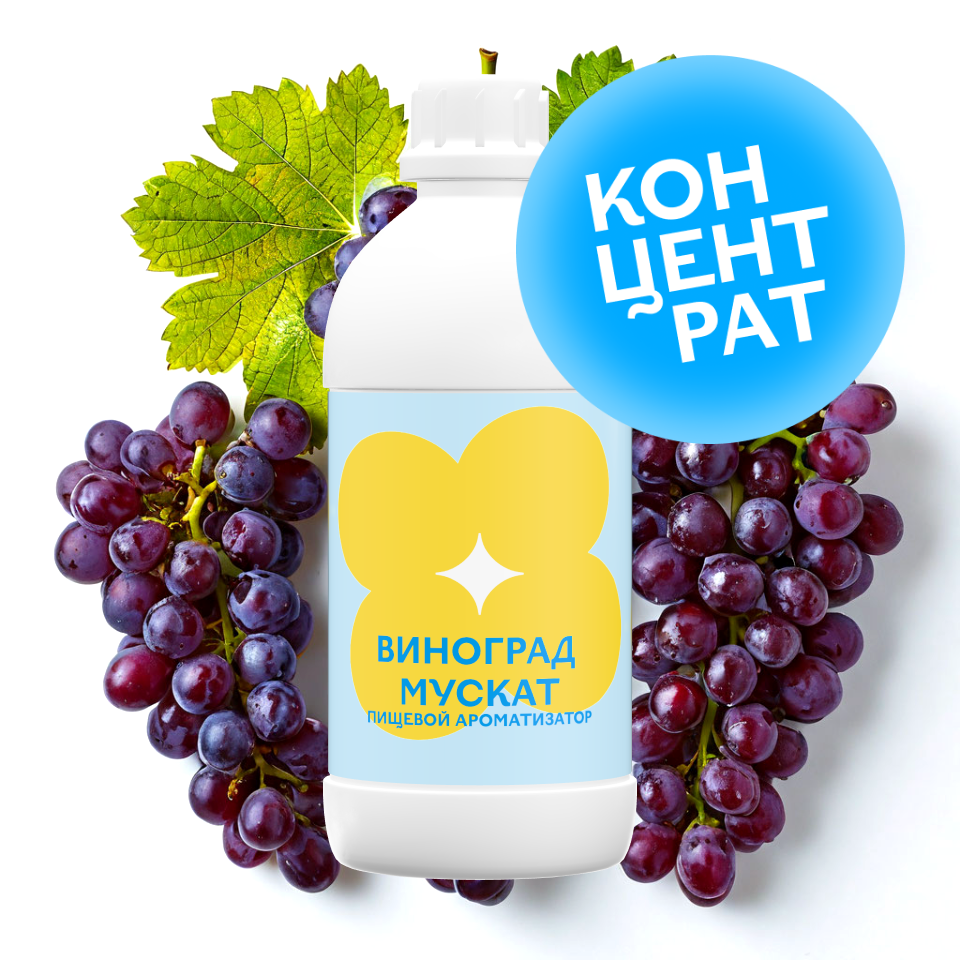 Ароматизатор пищевой «Виноград мускат» (концентрат) — выразительный виноградный вкус с характерной сладостью и пряными мускатными нотами. Придаёт продукции насыщенный и запоминающийся профиль, хорошо подходит для десертов, напитков, выпечки, молочной продукции и ЭСДН.